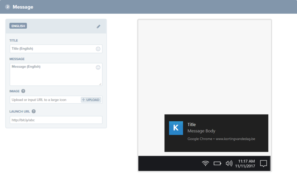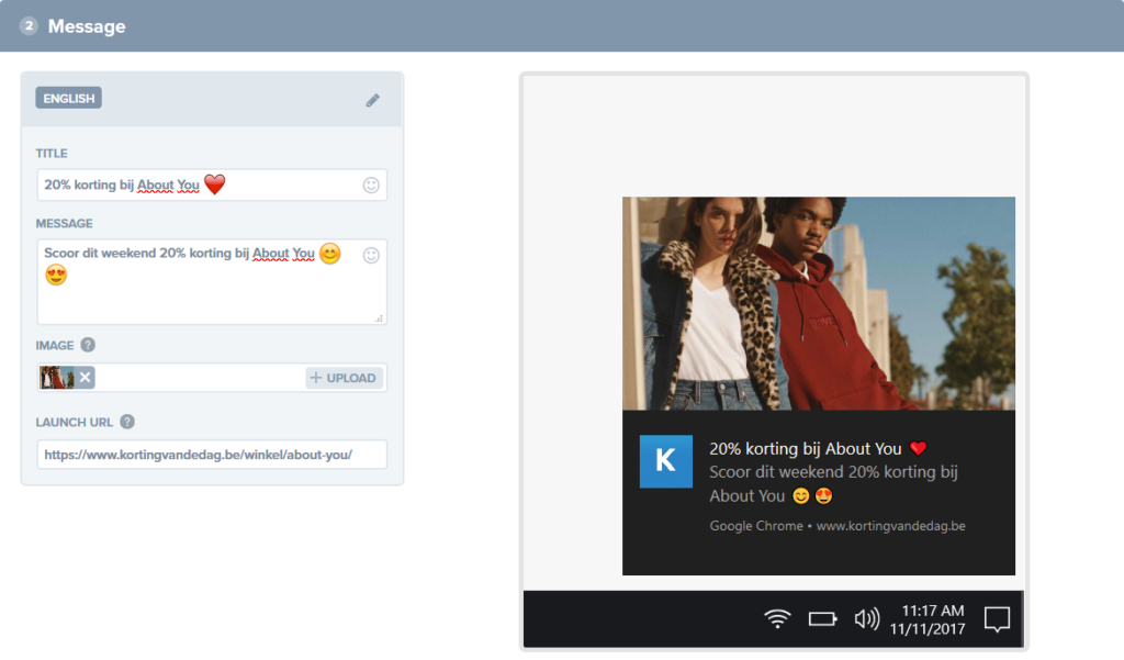 Make sure you always fill in the title, message, launch URL and add an image. This is an example of a push ready to launch: