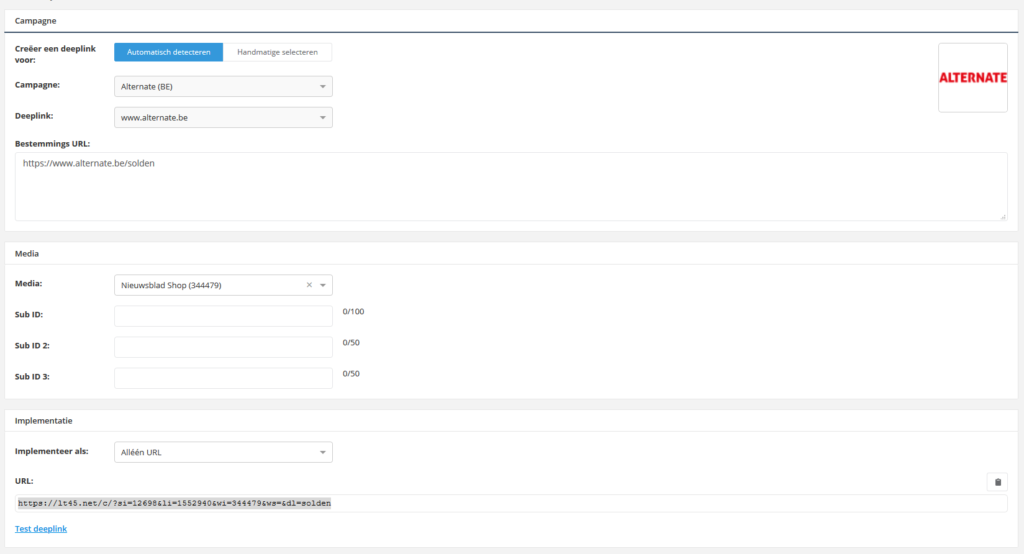 Next, input a deeplink, for example ‘https://www.alternate.be/solden’