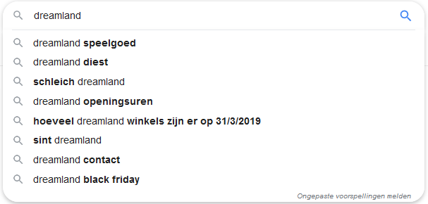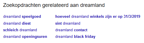 Same as with related keywords, we can use Google. Let’s use the example of ‘DreamLand’, a toy company from Belgium. If we type in ‘DreamLand’ in Google, you can find some ideas: